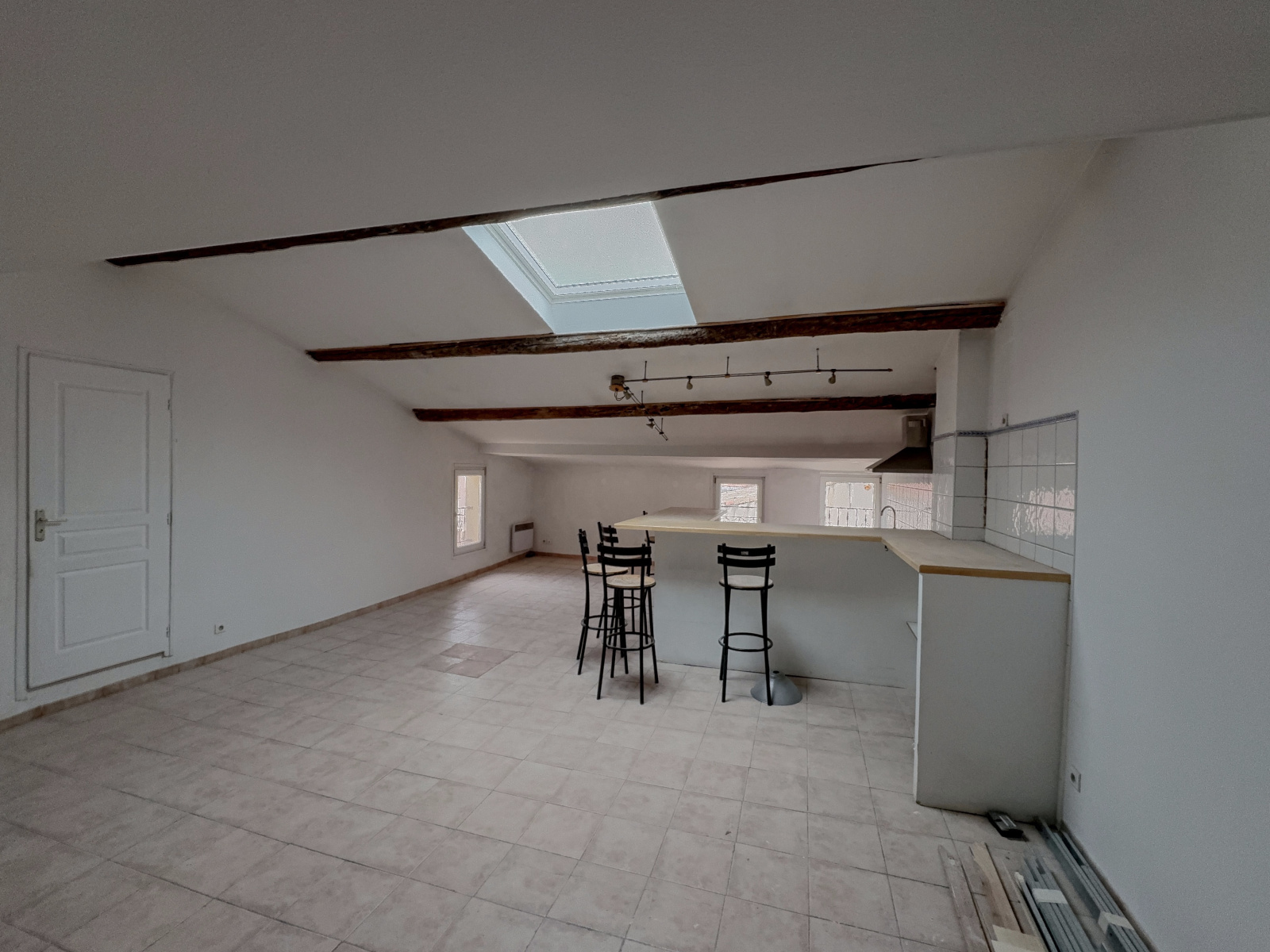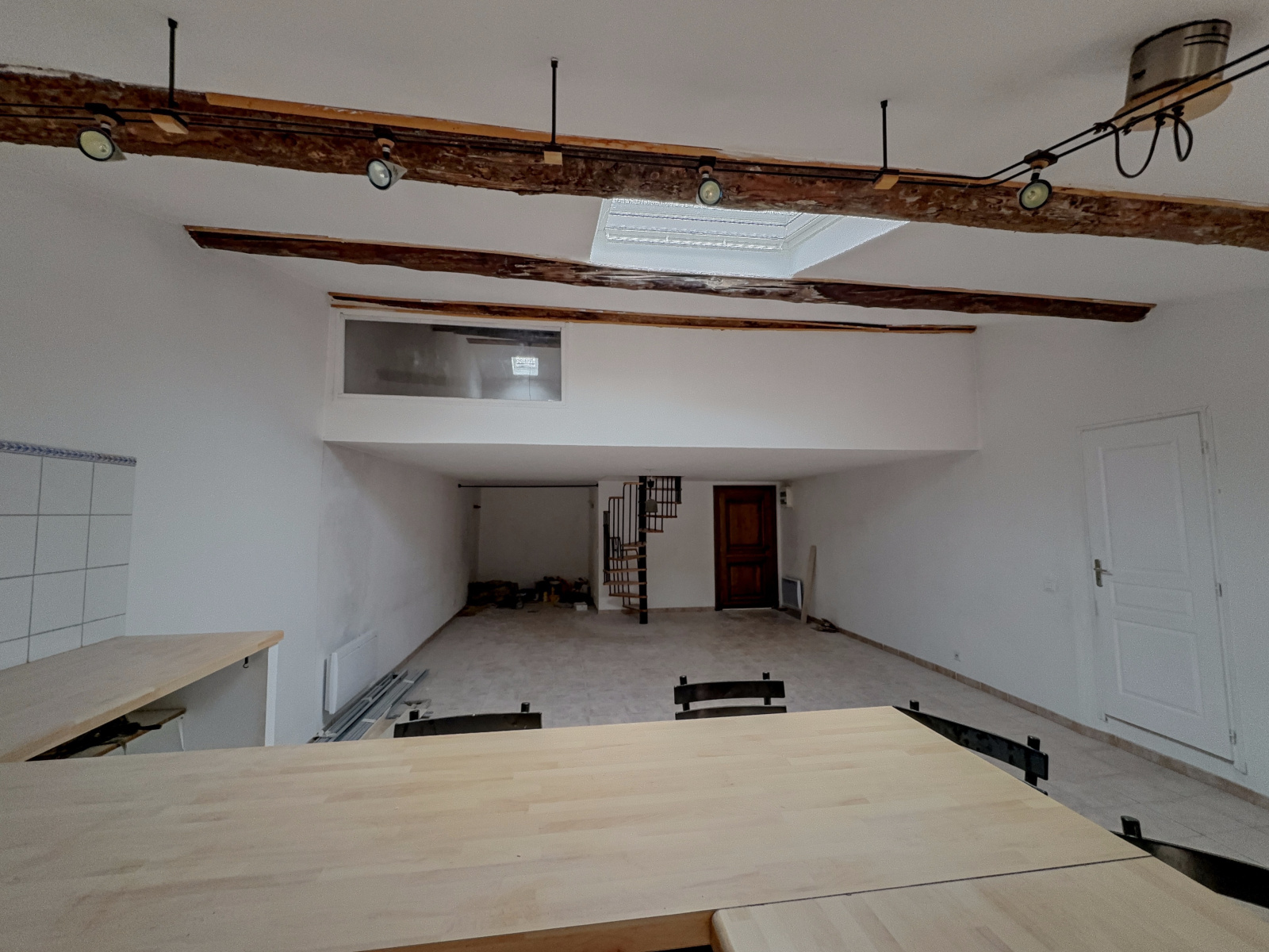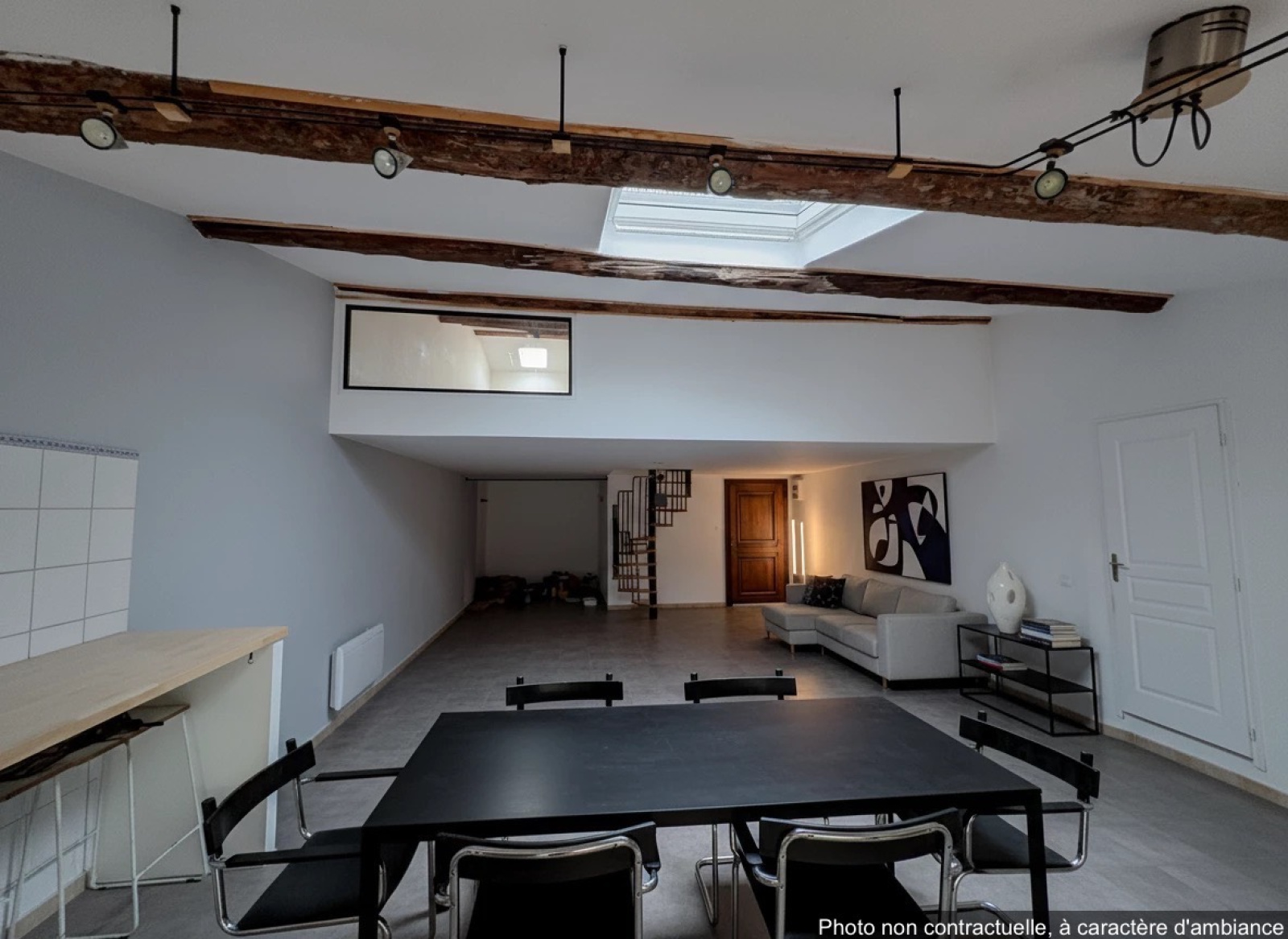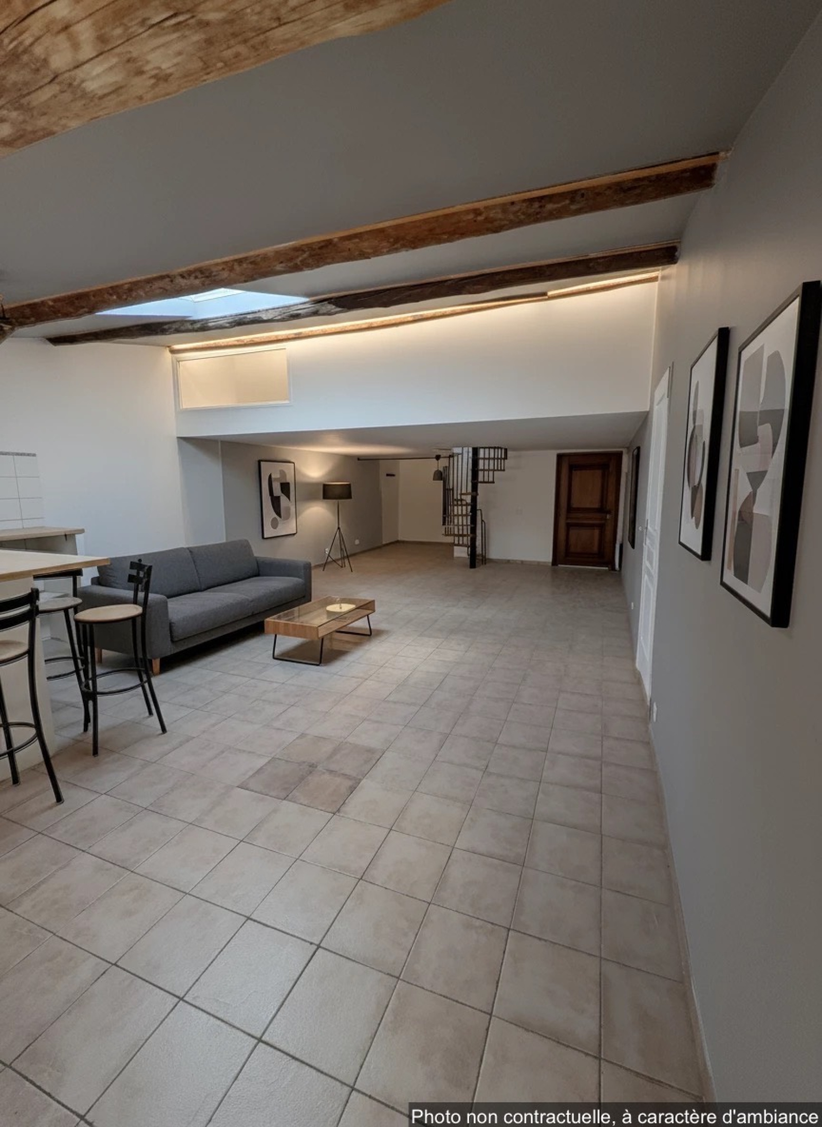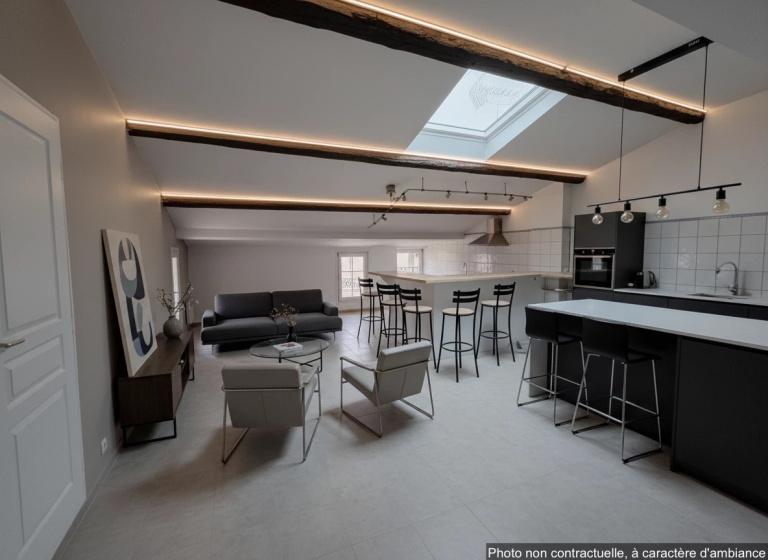 Description du bien: Situé au deuxième et dernier étage : Une entrée avec escalier, une spacieuse pièce de vie séjour / cuisine de plus de 60 m², baignée de lumière, une salle d’eau avec WC et au troisième étage en mezzanine, un coin nuit offrant deux chambres, idéales pour une famille, un couple ou un projet locatif.